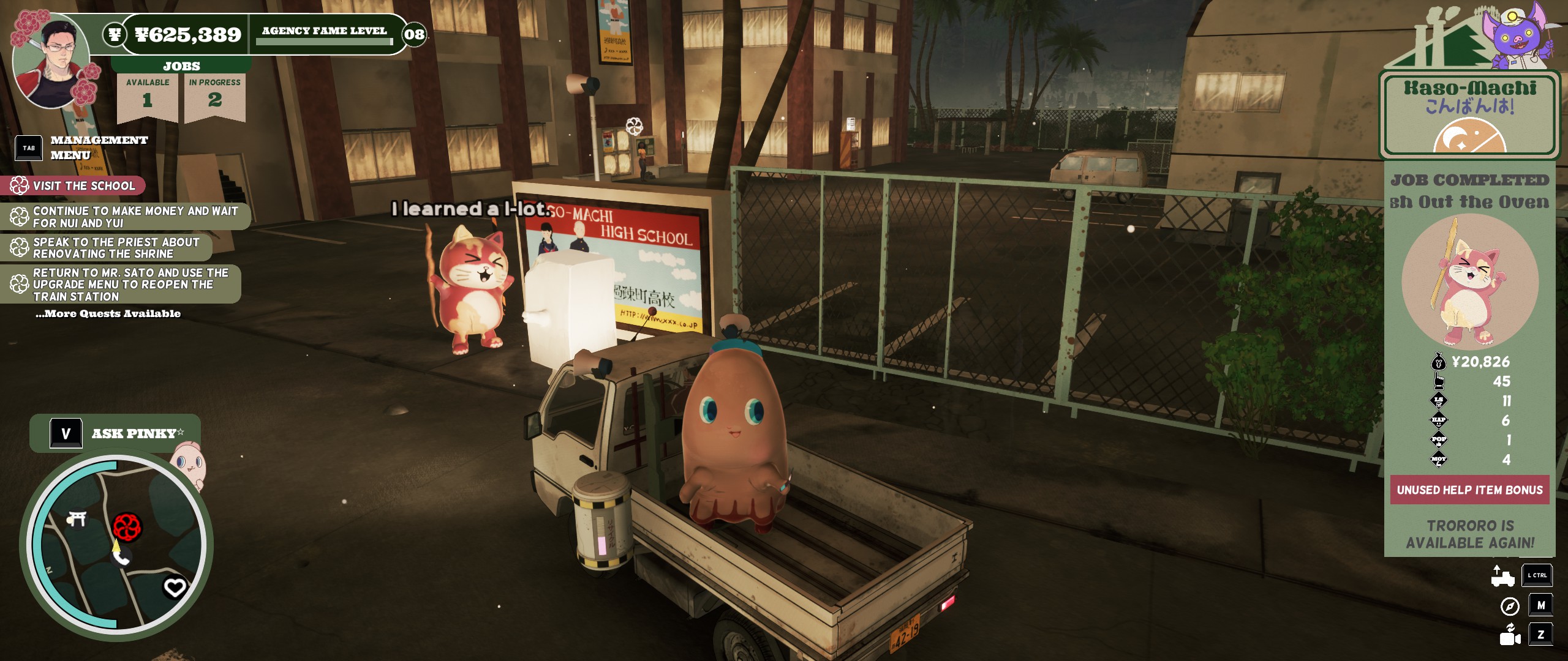 Реальность: упоротость никуда не делась, добавилась трогательная история, раскручивающаяся постепенно, с сайд-квестами, потрясающими персонажами и их историями. Проклятый (в буквальном смысле) городок, похожий одновременно на Инабу из четвертой Персоны и на Хинамидзаву из "Цикад" стал полноценным опенворлдом на двадцать пять часов минимум, больше - если вам захочется собрать все-все мелочи и облазить все-все углы. Грузовичок (кей-трак) героя учится плавать, летать и стрелять Пинки, как ракетой, по любым целям. Агентство маскотов растет, ширится и превращается из мелкого бизнеса на грани краха в монстра регионального масштаба, зарабатывающегомиллиарды. Оторваться невозможно!